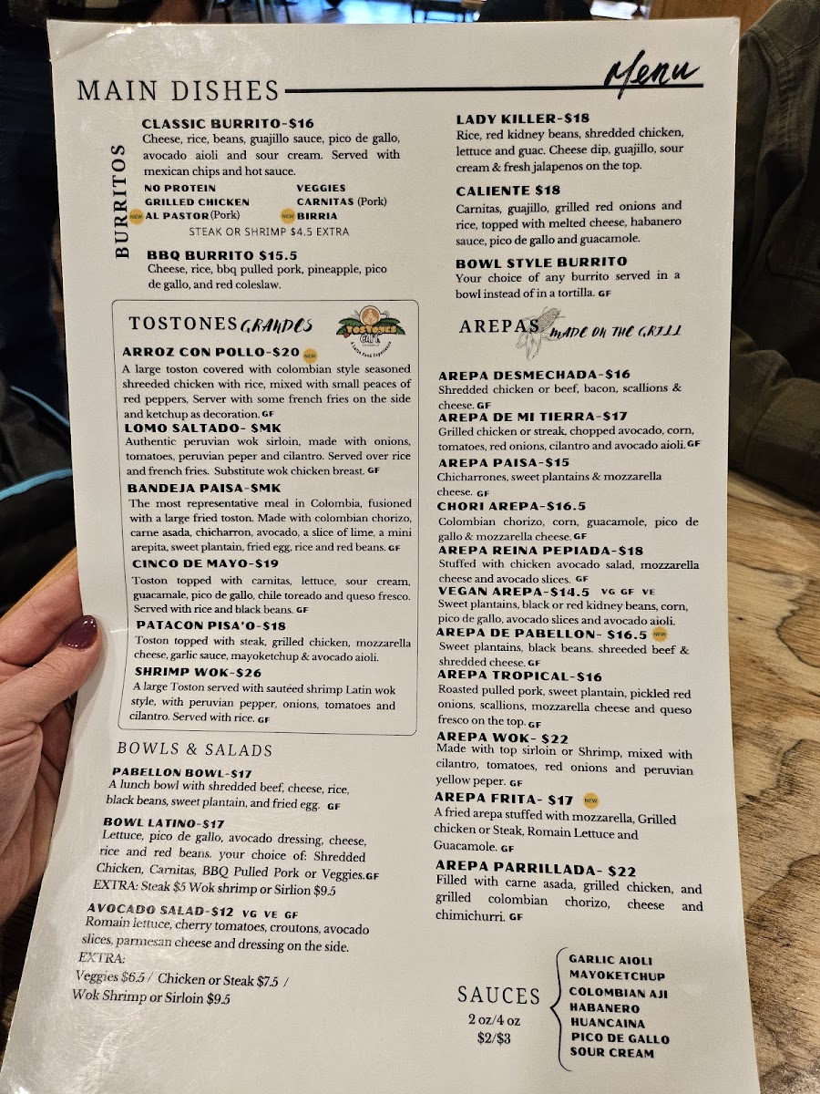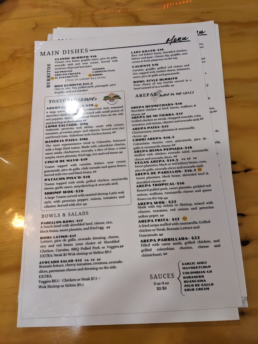Corn meal arepa with your choice of sirloin cubes or Shrimp, made it with red onions, tomatoes and cilantro.